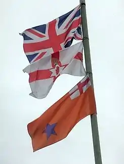 ![]() De arriba abajo, banderas del Reino Unido, Irlanda del Norte y la naranja de la Orden de Orange; esta última con la cruz de San Jorge y la estrella púrpura de las fuerzas de Guillermo de Orange. | ||
