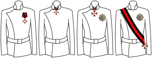 - Primera clase: Una cruz roja con bordes negros y dorados. La insignia de la Orden pendía de una banda colocada sobre el hombro derecho, y una estrella de ocho rayos de oro y plata estaba sujeta al pecho izquierdo.