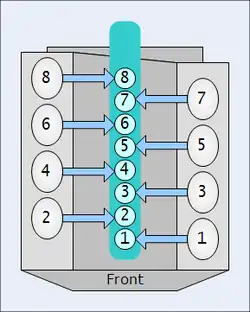 En la mayoría de los modelos fabricados por Audi y Ford equipados con motores V8, los cilindros 1-2-3-4 se encuentran en el lado derecho del automóvil, mientras que los otros cuatro cilindros se encuentran a la izquierda.
