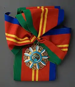 La insignia de la Orden de 1.er grado está sujeta a una bandolera de 100 mm de ancho.