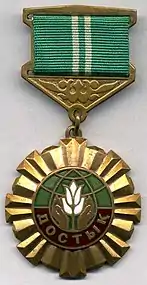 La Orden Dostyk es un círculo de múltiples etapas en forma de rayos triangulares alargados. En el centro de la orden hay un globo terráqueo, sobre un fondo verde opaco de esmalte rojo, dos palmas abiertas que sostienen una estilizada flor blanca de la vida. El nombre de la orden Dostyk está escrito en la parte inferior del círculo sobre un fondo de cereza.[2]