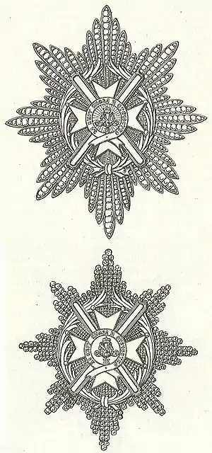 Cuando fueron concebidos el primer o segundo grado de esta orden en su versión "con espadas" las estrellas fueron ajustadas consecuentemente. Las espadas cruzadas no fueron incluidas en el medallón sino que fueron ubicadas sobre la cruz de san Andrés. Eligieron colocarlas por encima del brazo vertical superior de la cruz maltesa con las empuñaduras en las estribaciones de la corona de laureles.[6]