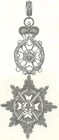 - Gran Cruz - Los miembros de esta categoría llevaban la venera de la orden pendiente de una banda grande que cruza por sobre el hombro derecho y se asegura sobre la cadera izquierda, más la placa de la orden sobre el lado izquierdo del pecho.