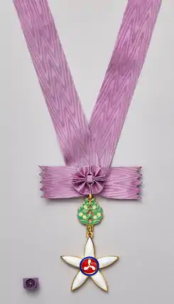 La insignia de la orden está bañada en oro con esmalte blanco, y tiene la forma de una flor de mandarina; el disco central tiene tres jades en forma de media luna (magatama). La insignia está suspendida en una corona de oro y esmalte de hojas de mandarina, que a su vez está suspendida en una cinta morada que se lleva alrededor del cuello.