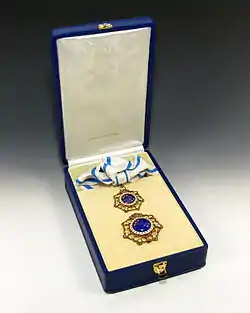 - Venera: de iguales características que la placa, pende de una banda de muaré de seda blanca con dos franjas azules en cada extremo para la Primera clase o de un lazo de dama para la Segunda clase con los mismos colores.