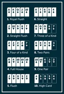 - Matemáticas − Póquer: la probabilidad de obtener un color en póquer es de 1 entre 507,8, esto es de 1,9 × 10-3 (0,19%).