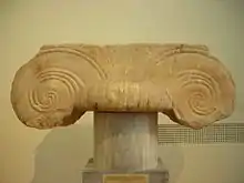 Algunas tumbas etruscas muestran un capitel similar, con dos grandes volutas que no están tumbadas, pero no hay palmetas en el centro.