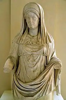 El título sacerdos se especificaba a menudo en relación con una deidad o un templo,[14][15] como una sacerdos Cereris o Cerealis , "sacerdotisa de Ceres", un cargo nunca ocupado por hombres.[16] Los sacerdotes femeninos desempeñaron un papel principal en los santuarios de Ceres y Proserpina en Roma y en toda Italia que observaron el llamado "rito griego" (ritus graecus). Esta forma de culto se había extendido desde Sicilia bajo la influencia griega, y el culto aventino (Tríada Aventina) de Ceres en Roma estaba encabezado por sacerdotes varones.[17] Sólo las mujeres celebraban los ritos de la Bona Dea ("Buena Diosa"), para quienes se registran los "sacerdotes".[18] El Templo de Ceres en Roma fue ordenado por la Sacerdotisa de Ceres, Sacerdos Cereris, y el Templo de Bona Dea por la Sacerdotisa de Bona Dea, Sacerdos Bonae Deae. Otras sacerdotisas fueron Sacerdos Liberi, Sacerdos Fortunae Muliebris y el Sacerdos Matris Deum Magnae Idaeae; las sacerdos también sirvieron como sacerdotisas del culto imperial.