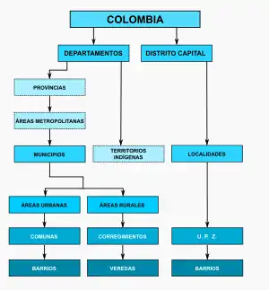 Los municipios corresponden al segundo nivel de división administrativa en Colombia, que mediante agrupación conforman los departamentos. Colombia posee 1.103 municipios,[3] que de acuerdo con el Artículo 311 de la Constitución Política de Colombia de 1991, la Ley 136 del 2 de junio de 1994 y la ley 1551 de 2012 es la entidad territorial fundamental de la división político-administrativa del Estado, con autonomía política, fiscal y administrativa dentro de los límites que le señalen la Constitución y las leyes de la República.