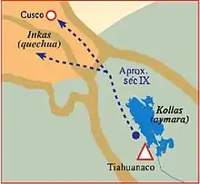 Tras hacer una parada en el pequeño reino de Pallata, Manco Cápac y su contingente atacaron a tres pequeñas tribus que habitaban el valle del Cuzco; los Sahuares, Huallas y Alcahuisas,[1] y al ver sus excelentes condiciones de buen clima y suelos fértiles, decidieron establecerse allí, en una zona pantanosa entre dos pequeños arroyos, que hoy corresponde a la Plaza de Armas del Cuzco.[4] La aldea recién fundada se dividió en cuatro distritos; Chumbicancha, Quinticancha, Sairecancha y Yarambuycancha.[5]