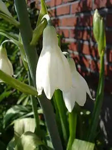Alcanza un tamaño de hasta 1,2 m de altura, con hojas carnosas verdegrisáceas y tallos erectos que sostienen espigas laxas de hasta 30 flores colgantes, acampanadas y blancas, a veces matizadas o marcadas de verde. Florece desde mediados de verano.