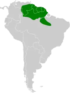 Se distribuye en el sur y este de Venezuela, Guyana, Surinam, Guayana Francesa y norte de Brasil, al norte del bajo río Amazonas y al este del río Negro. Se especula que también ocurra en las adyacencias del sureste de Colombia.[5]