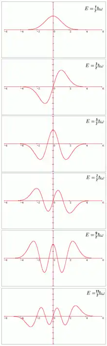 Se puede demostrar que las funciones de onda, , cuyo módulo al cuadrado describe la densidad de probabilidad de que la partícula tenga una determinada posición , son el producto de exponenciales por los polinomios de Hermite. La figura de la derecha muestra la forma de dichas funciones para los seis autoestados con energía más baja (el estado de menor energía es el que figura en la parte superior de la misma). En particular, la energía del nivel n-ésimo será:
