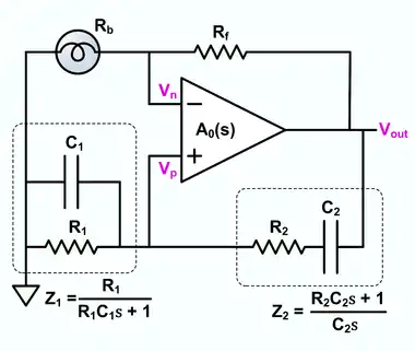Donde es la tensión de entrada, es la tensión de salida, y es la impedancia de realimentación. Si definimos la ganancia de voltaje como: