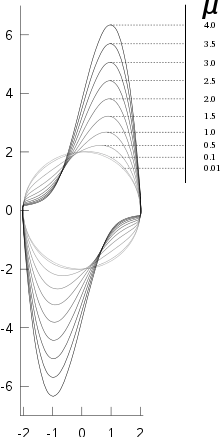 en la que x es la posición, función del tiempo t, y μ es un parámetro escalar que gobierna la no linealidad y el amortiguamiento.