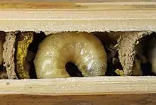 La abeja inspecciona varios antes de decidirse por uno. Acumula polen, que amasa con néctar y saliva, al final del tubo que es su nido. La abeja necesita visitar muchas flores para coleccionar suficiente polen y néctar para una cría. Cuando así lo ha hecho, deposita un huevo encima de la masa de polen y construye un tabique. A continuación empieza a almacenar polen nuevamente y sigue así construyendo nuevas celdillas hasta completar el agujero. El tabique final es más grueso y fuerte que los anteriores. Después, si tiene tiempo, busca otro agujero e inicia otro nido.[4][5]