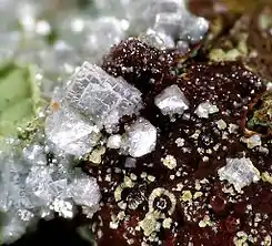 Suele encontrarse asociado a otros minerales como: smithsonita, cerusita, hidrocincita, hemimorfita, azurita, malaquita, rosasita, olivenita, piromorfita, calcita o fluorita.