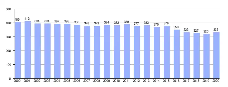 Gráfica de evolución demográfica de Oteruelo de la Valdoncina[2] entre 2000 y 2020 |