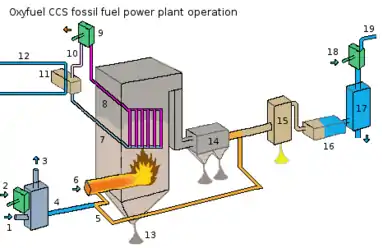 Actualmente, se están realizando investigaciones para operar centrales termoeléctricas de combustibles fósiles con mezclas de gases enriquecidas con oxígeno en lugar de aire. Casi todo el nitrógeno se elimina del aire de entrada, lo que produce una corriente que contiene aproximadamente un 95% de oxígeno.[3] La combustión con oxígeno puro daría como resultado una temperatura de llama demasiado alta, por lo que la mezcla se diluye con gas de combustión recirculado o mediante combustión por etapas. El gas de combustión recirculado también se puede utilizar para transportar combustible a la caldera y garantizar una transferencia de calor por convección adecuada a todas las áreas de la caldera. La oxicombustión produce aproximadamente un 75% menos de gases de combustión que la combustión con aire y produce gases de escape formados principalmente por CO2 y H2O.