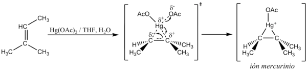 Inicialmente se produce la adición electrofílica del acetato de mercurio; formándose un catión mercurinio.[1]