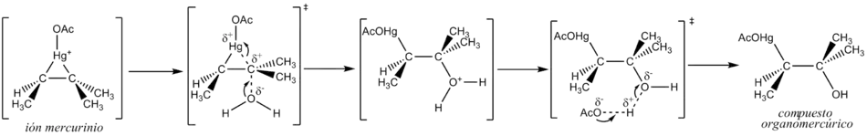 Luego se produce la adición nucleofílica anti de agua en el carbono más sustituido (regioquímica Markovnikov). El agua luego se desprotona y se obtiene un compuesto organomercúrico.[1]