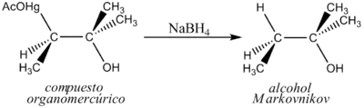 El compuesto organomercúrico se trata posteriormente con borohidruro de sodio, generando una reducción del mercurio y la formación del alcohol.[1] Se cree que la reacción se produce con intervención de radicales libres.[1]