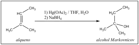 La oximercuración es un proceso químico que permite partiendo de un alqueno obtener un alcohol con regioquímica Markovnikov.[1] El proceso ocurre mediante dos reacciones y se obtienen los productos con buenos rendimientos.