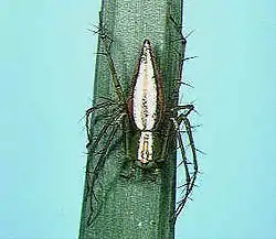 Habita en Japón y desde China hasta Australia.[1] Son depredadores activos que cazan invertebrados (incluidas otras arañas) entre la vegetación. Son especialmente comunes en áreas verdes y campos de arroz. Sus cuerpos son característicamente largos y delgados, aproximadamente cuatro veces más largos que anchos. El color de su cuerpo varía de blanco pálido a amarillo, naranja o verde; con un patrón de líneas longitudinales negras, naranjas y blancas. Las hembras tienen una longitud corporal máxima de 10 mm (0,39 pulgadas), mientras que los machos crecen hasta 9 mm (0,35 pulgadas).[2]