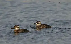 El pato rana de pico delgado o malvasía argentina[1] (Oxyura vittata), es una especie de ave anseriforme de la familia Anatidae. Es un pequeño pato zambullidor, natural de América del Sur.