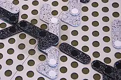 - En cada color (blanco y negro) 18 piezas de juego del tamaño de 3 casillas del tablero. Entre ellos hay 6 rectos (3 cuadrados seguidos), 6 angulares y 6 triangulares. Hay una caja de color en cada piedra, esta caja se llama PÜNCT.