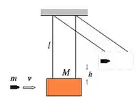 Este péndulo está constituido por un bloque grande de madera, de masa M, suspendido mediante dos hilos verticales, como se ilustra en la figura. El proyectil, de masa m, cuya velocidad v se quiere determinar, se dispara horizontalmente de modo que choque y quede incrustado en el bloque de madera. Si el tiempo que emplea el proyectil en quedar detenido en el interior del bloque de madera es pequeño en comparación con el período de oscilación del péndulo (bastará con que los hilos de suspensión sean suficientemente largos), los hilos de suspensión permanecerán casi verticales durante la colisión. Supongamos que el centro de masa del bloque asciende a una altura h después de la colisión. Entonces, conocidos las masas del proyectil y del bloque y el ascenso de este después del choque, la velocidad del proyectil viene dada por