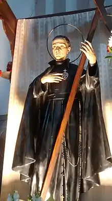 Atributos | Vestido con el hábito pasionista, el Santo Rosario Instrumentos de la Pasión de Cristo, una calavera y un instrumento de disciplina. | ||