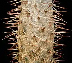 En su hábitat natural puede llegar a alcanzar más de 8 m de altura. El tronco es grueso, más ancho en la base (de hasta 90 cm de diámetro). Las hojas, de hasta 40 cm de largo, están situadas en la parte superior de la planta, las inferiores van cayendo a medida que el tallo crece, dejando una pequeña cicatriz por debajo de la areola de donde surgen tres largas y fuertes espinas dispuestas triangularmente, estos grupos espinosos de disponen en líneas diagonales a lo largo de todo el tronco.