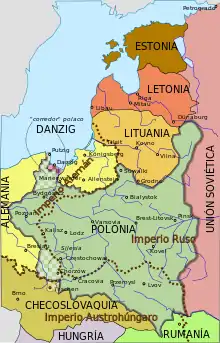 La alianza franco-polaca, basada en un acuerdo político y militar firmado en febrero de 1921,[19] comenzó pronto a debilitarse. En 1921-1922 los franceses no lograron el respaldo británico a su alianza con los polacos.[19] Gran Bretaña mantuvo su negativa a involucrarse en el sistema de alianzas francés en Europa oriental o a ofrecer una garantía general de todas las fronteras trazadas en 1919.[20] Francia, convencida de la necesidad del apoyo británico para mantener su seguridad frente a Alemania, comenzó a partir de 1924 a desarrollar una política que lograse dicho apoyo, postura facilitada por la política exterior alemana durante el periodo del ministerio de Gustav Stresemann, que buscaba la estabilidad en la frontera occidental mientras propugnaba la revisión en la oriental.[20] Los intentos polacos de lograr una garantía equivalente al Tratado de Locarno para la frontera oriental alemana con apoyo francés fracasaron.[20]