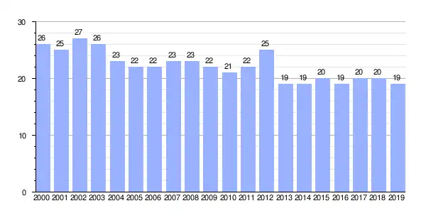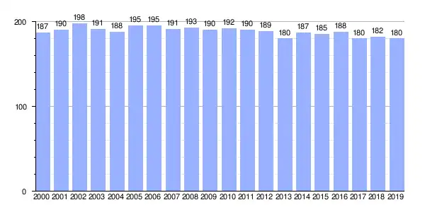 Gráfica de evolución demográfica de Paderne (parroquia) entre 2000 y 2019 |