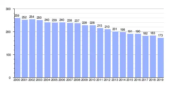 Gráfica de evolución demográfica de Padreiro entre 2000 y 2019 |