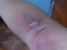 El manejo es el recomendado para una dermatitis de contacto: eliminar el agente irritante, lavar con agua y jabón, y aplicar compresas húmedas. Los antibióticos sólo se utilizan si hay una infección secundaria. Los antihistamínicos orales y los corticosteroides tópicos son útiles para aliviar los síntomas.[10]