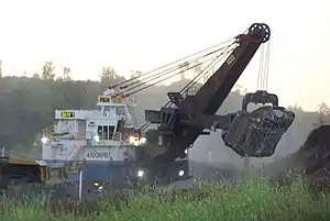 - Cucharón: fijo, dispuesto en el extremo de un brazo móvil, de accionamiento mecánico o hidráulico, soportado por una pluma fija. La capacidad del cucharón varía desde las 15 toneladas hasta las 120 toneladas en los modelos más grandes en la actualidad.
