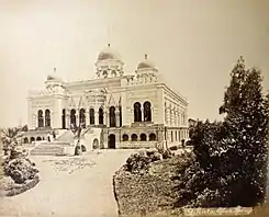 Disponía de tres cúpulas islámicas, dos minaretes que sobrepasaban con creces las cúpulas laterales e igualaban la central, resultando una hibridación de torreones islámicos con campaniles bizantino venecianos.