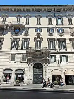 Las salas visitables se hallan en la planta principal, mientras que las lonjas de la planta baja orientadas a la Via del Corso están ocupadas por comercios. Esta fachada del bloque es la considerada principal y su aspecto actual, de gusto rococó, es producto de una remodelación realizada a principios del siglo XVIII por el arquitecto Gabriele Valvassori.[3] Las formas ondulantes de esta fachada suscitaron críticas en la época neoclásica, si bien se respetaron y constituyen un inusual ejemplo de influencia francesa en Roma.