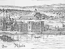 La construcción del nuevo palacio comenzó en 1627 a instancias del arzobispo Georg Friedrich von Greiffenklau.[2] El ala del Rin del nuevo palacio no se pudo terminar hasta 1678. La construcción se retrasó por la Guerra de los Treinta Años y la Guerra de la Gran Alianza. Se desconoce la planta original, obra de un padre capuchino, Matthias von Saarburg, que ha sido identificado como el maestro de obras, pero probablemente era una construcción de cuatro alas, comparable a las reparaciones de 1604 en el castillo de Johannisberg. Se puede suponer que el Martinsburg permaneció en pie solo debido a los retrasos.