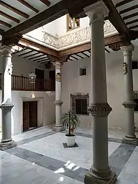 - Patio con columnas aragonesas, friso y zapatas de madera talladas.