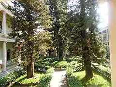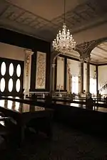 En su interior existen 104 habitaciones,[21] entre las que resaltan cuatro salones principales con colores distintivos: el Salón Rojo, utilizado desde su inauguración hasta la administración del general Maximiliano Hernández Martínez para la ceremonia de presentación de credenciales de embajadores o para las recepciones de la Cancillería Salvadoreña; Salón Amarillo, empleado como oficina del Presidente de la República; Salón Rosado, que alojaba a la Corte Suprema de Justicia, y posteriormente al Ministerio de Defensa;[25] y especialmente el Salón Azul, que fue declarado Monumento Histórico Nacional en 1974. En este aposento resaltan sus detalles jónicos, corintios y romanos; y fue allí donde se congregó la Asamblea Legislativa desde 1906. El nombre de dicha estancia fue heredado a la actual sala de reuniones del parlamento salvadoreño. También existe el Salón Jaguar en el que se visualizan elementos de la cultura indígena.[26]