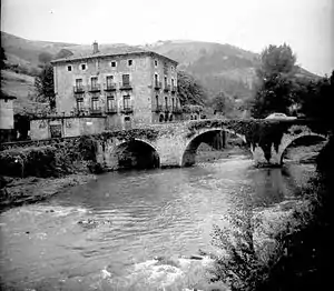El puente adosado al palacio consta de tres arcos de medio punto, con apartadero central sobre tajamar circular. Se encuentra construido con mampostería, excepto los esquinales de los arcos. Su perfil es ligeramente alomado. A simple vista se aprecian modificaciones en su trazado.