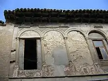 Los vanos fueron distribuidos de forma asimétrica y son adintelados. Los de la planta principal tienen tres arquillos en el interior del hueco y una moldura dispuesta a manera de alfiz en el contorno. El piso alto está recorrido por una galería, de arquillos doblados con ventanas trigeminadas (posiblemente tuvieron, cada una de ellas, dos finas columnas que desaparecieron en época desconocida), encajada entre las dos torres.
