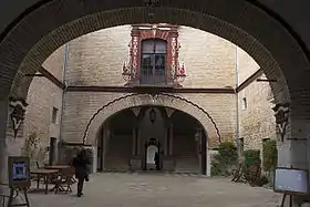 El patio es de planta rectangular y en su costado derecho se abre una portada en piedra, que da acceso a las caballerizas. Estas se caracterizan por presentar planta rectangular de tres naves, separadas por columnas toscanas de mármol y arcos de medio punto en ladrillo; la cubierta, por su parte, se resuelve a base de bóvedas baídas. A ambos lados de los muros de cerramiento se sitúan pesebres o abrevaderos, decorados en sus zócalos con pinjantes. Las caballerizas conservan la primitiva entrada independiente.