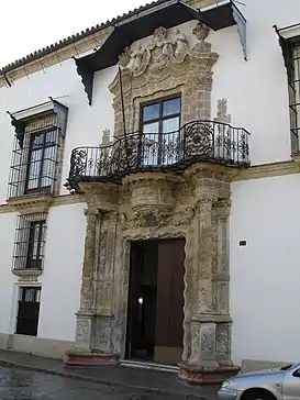 La portada es de estilo barroco. Tiene dos cuerpos de altura, está elegantemente trazada y su ejecución es resuelta, tanto en su diseño como en su decoración. En ella destacan las columnas labradas en su fuste y sobre pedestales girados, que avanzan en la fachada para sostener un movido balcón, triplemente curvado por la inclusión en su centro de una rotunda ménsula cilíndrica. Un variado repertorio de curvas, contracurvas, ondas y quebrados contribuyen a exaltar, como en un retablo, la composición central sobre el hueco superior.