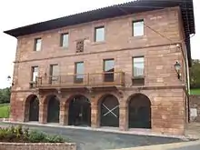 Uno de los elementos más definidores de este edificio es el pórtico que se abre en la planta baja con cinco huecos de medio punto, que dan paso a la vivienda a través de una puerta adintelada enmarcada por sencillas pilastras almohadilladas y flanqueada por sendas ventanas con los enmarques en resalte. En línea con los arcos se sitúan ya en el primer piso otros cinco vanos, de los cuales los tres centrales forman un balcón cuyo saledizo descansa sobre gruesas ménsulas molduradas. Finalmente, cuatro ventanas se ubican en el tercer nivel, quedando en el centro un sencillo escudo de armas, que habla de la nobleza de sus propietarios. El blasón, con yelmo por timbre y flanqueado por sendos niños desnudos y leones, es cuartelado, acogiendo las armas de los Borda, Echenique y Arrechea, más el blasón del valle de Baztán.[2]