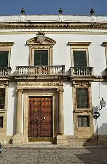 La actual fachada, de estilo renacimiento-neoclásico, fue construida en 1785 por José Vargas y Sánchez. Se compone de dos plantas. La puerta principal está flanqueada con dos columnas jónicas y sobre ella, un balcón enmarcado bajo un arco.