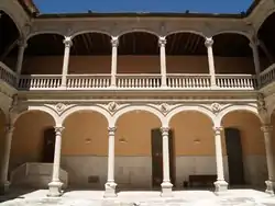 El patio porticado es rectangular y de dos plantas, formado por columnas y arcos rebajados en la planta baja, y arcos carpaneles y balaustradas entre las columnas acanaladas en la superior, con capiteles finamente esculpidos. En las enjutas de los arcos de ambas plantas aparecen medallones con bustos de los reyes y reinas de Castilla debidos al escultor Esteban Jamete.[nota 4] En ellos están representados siguiendo un orden cronológico los reyes comprendidos entre Fernando I y Felipe el Hermoso. Completan la decoración ocho escudos con las armas de la familia situados en los ángulos del patio.